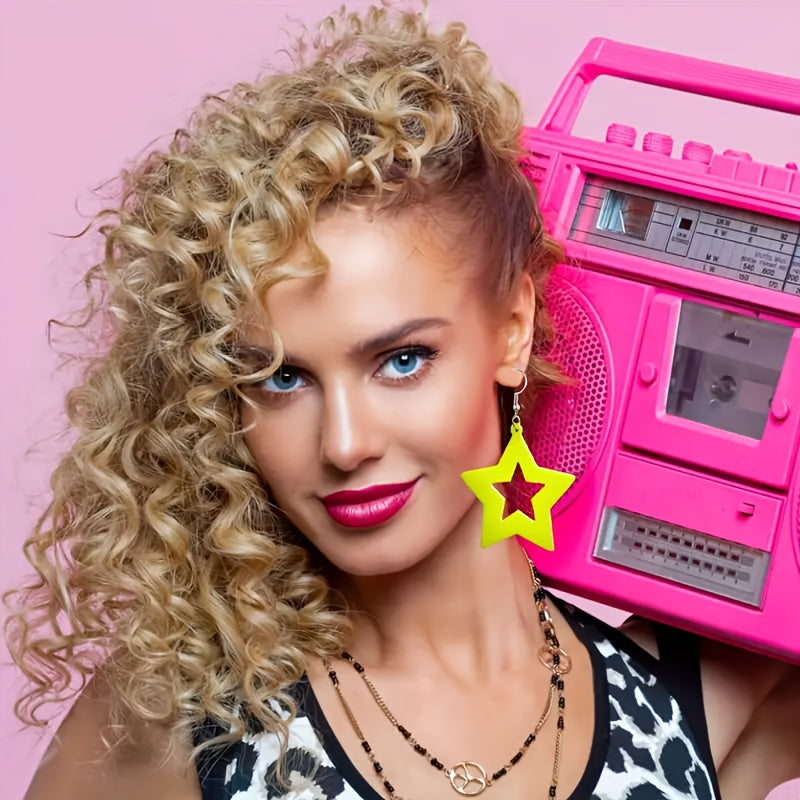 1/4 pair of neon star earrings made of acrylic material, with bright pink, orange, yellow, and green colors as perfect party gifts to express your sincere emotions. Party earrings with bright colors, hanging earrings design,