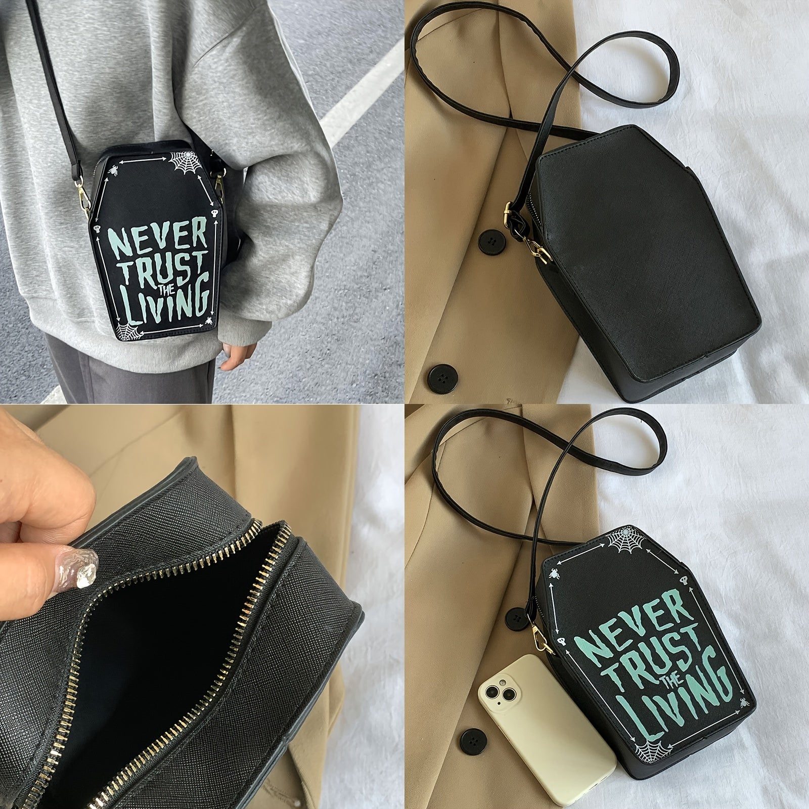 1pc Halloween Coffin-Shaped Fashion Shoulder Bag for Women, Sexy Gothic Faux Leather Crossbody Purse with "Never Trust The Living" Print, Zip Closure, Polyester Lining, and Edge Detailing