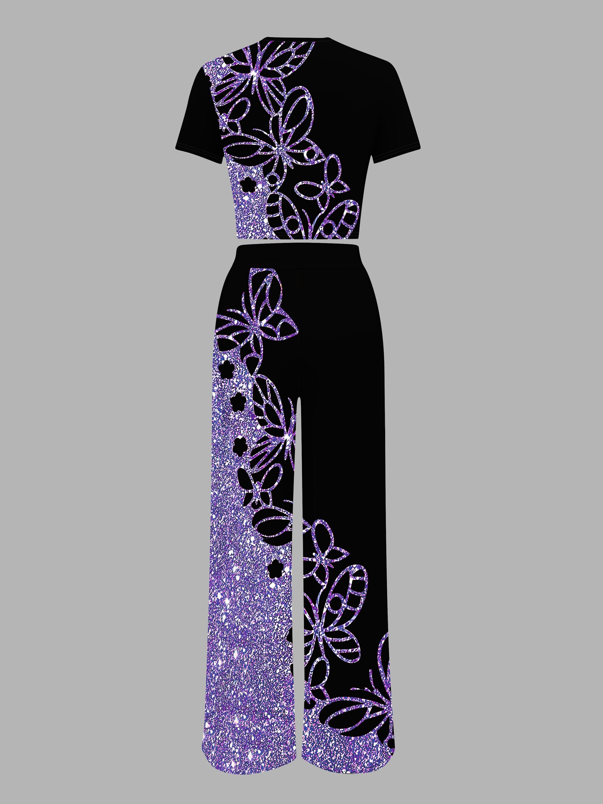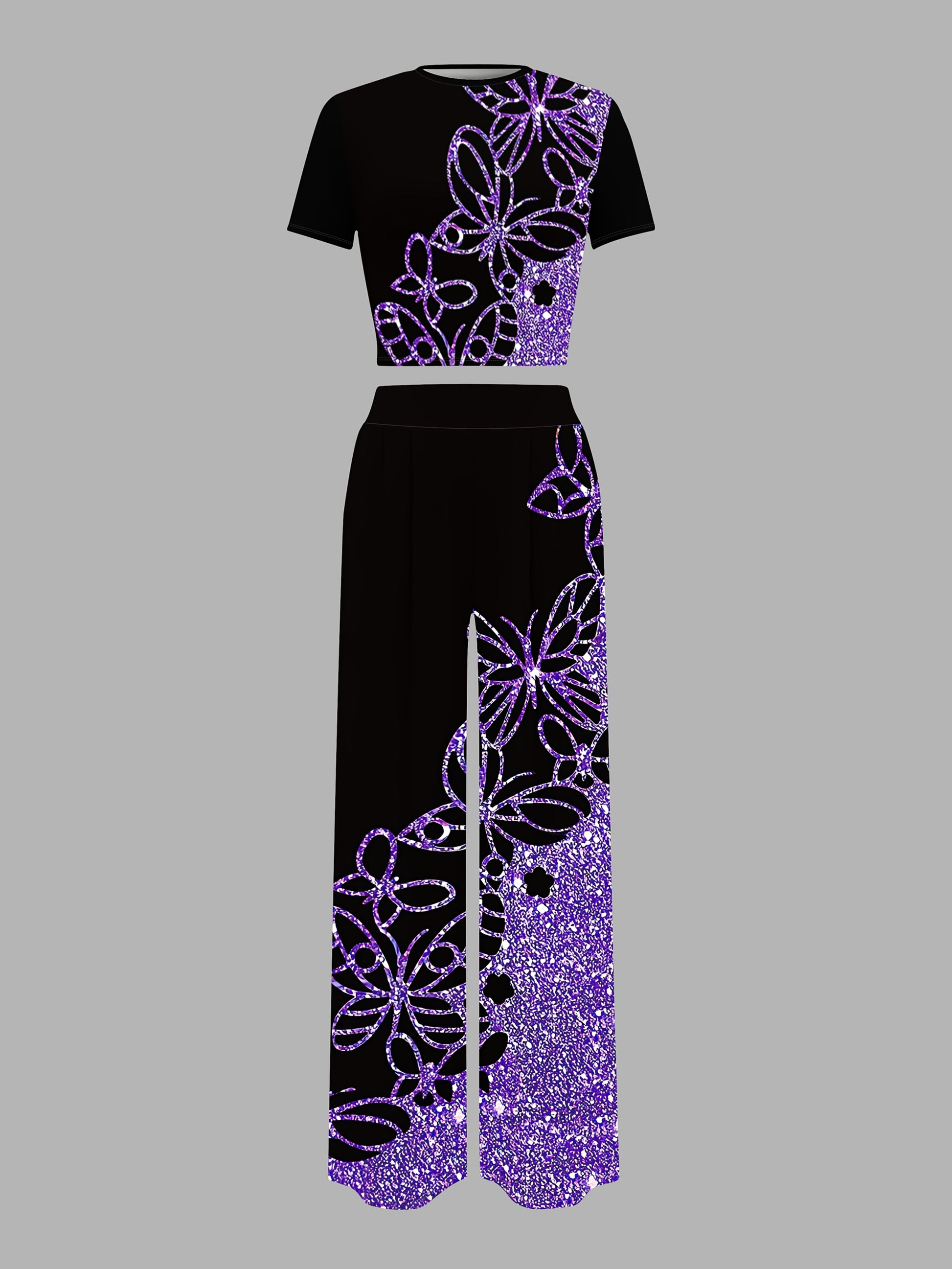 Elegant 3D Floral Print Crop Top & Glittery Purple Pants Set - Sexy, Stretchy Polyester, All-Season Wear, Perfect for Casual or Stylish Outfits, Seasonal Fashion | Floral Print Top | Glittery Legging