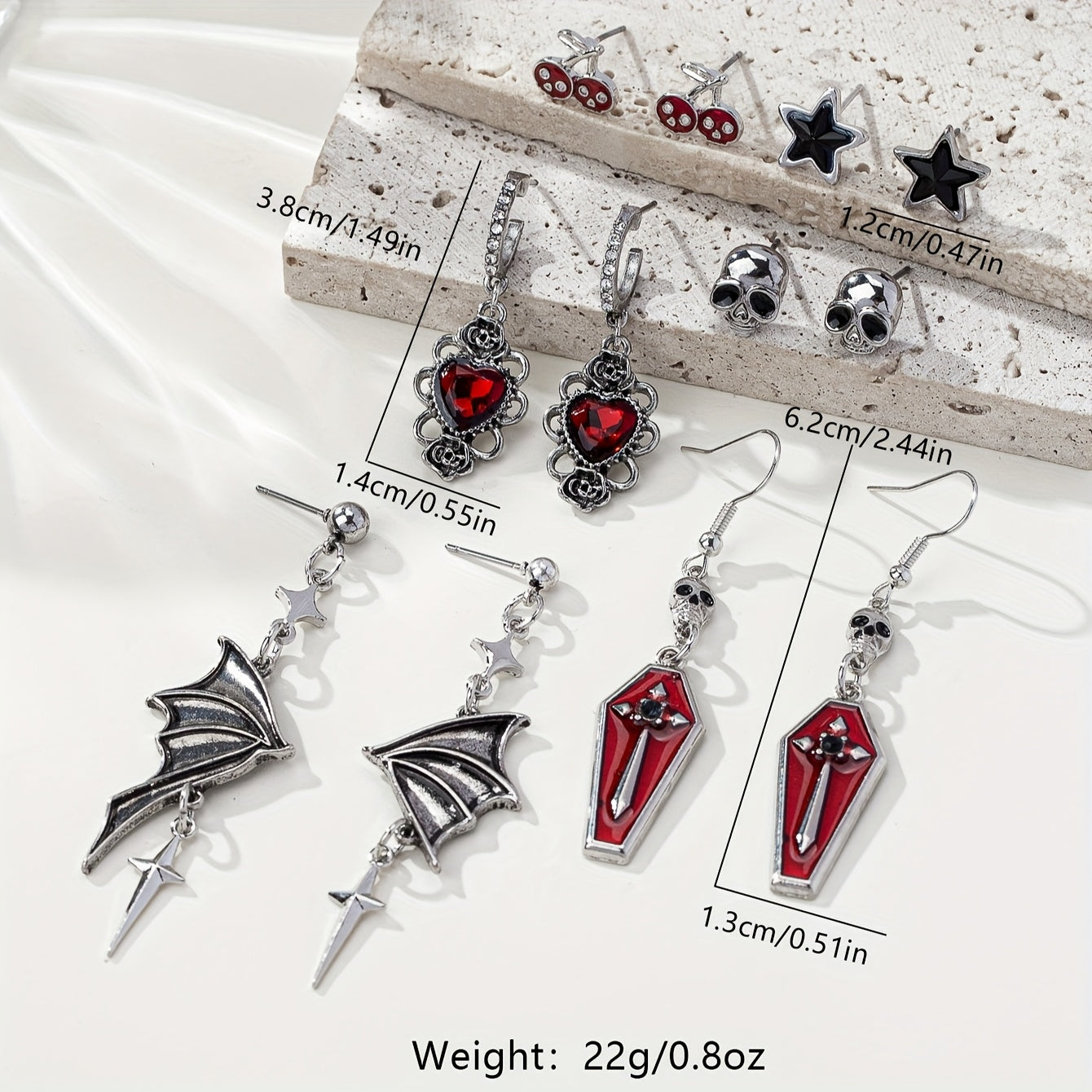 [Gothic Halloween Earrings] Gothic Skull Rose Bat Wing Coffin Halloween Earring Set - Six-Pair Five-Star