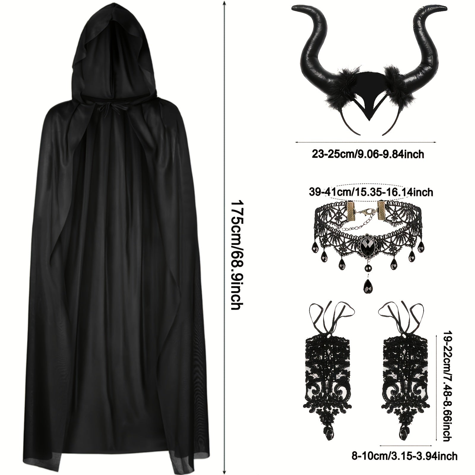 [Halloween Devil Costume Set] 5pcs Halloween Devil Costume Set | Black Witch Cape, Devil Horns Headband, Lace Fingerless Gloves, Gothic Queen Dress Up, Carnival Wizard Party Accessories