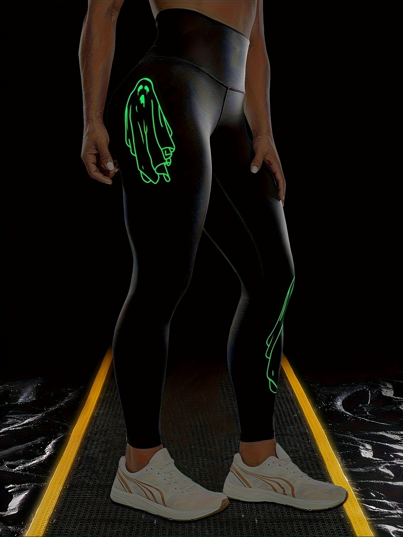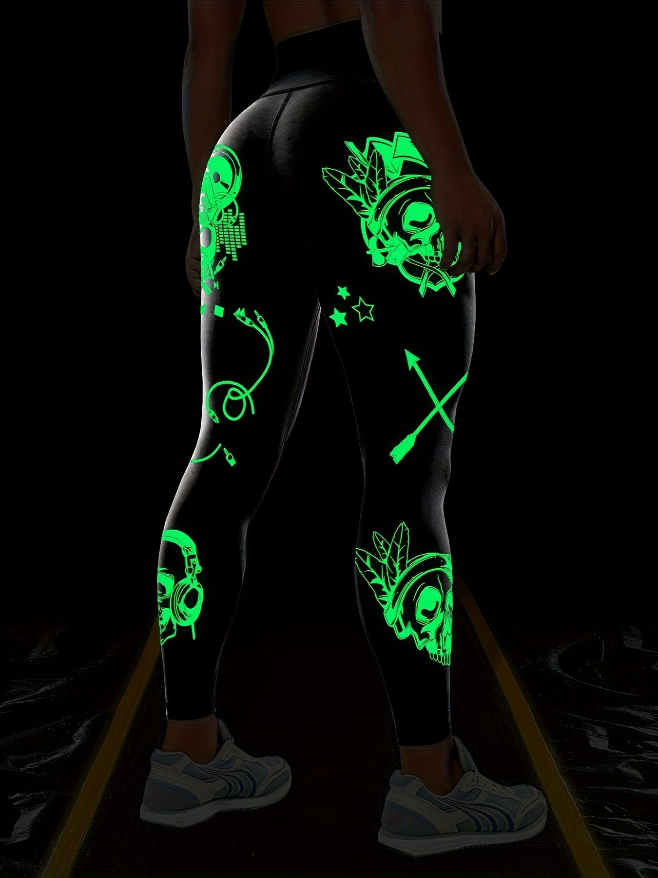 Halloween Fluorescent Skeleton Hands Printed Sports Yoga Leggings, High Waist Workout Running Sports Tight Pants, Women's Activewear Carnaval for carnival & Music Festival