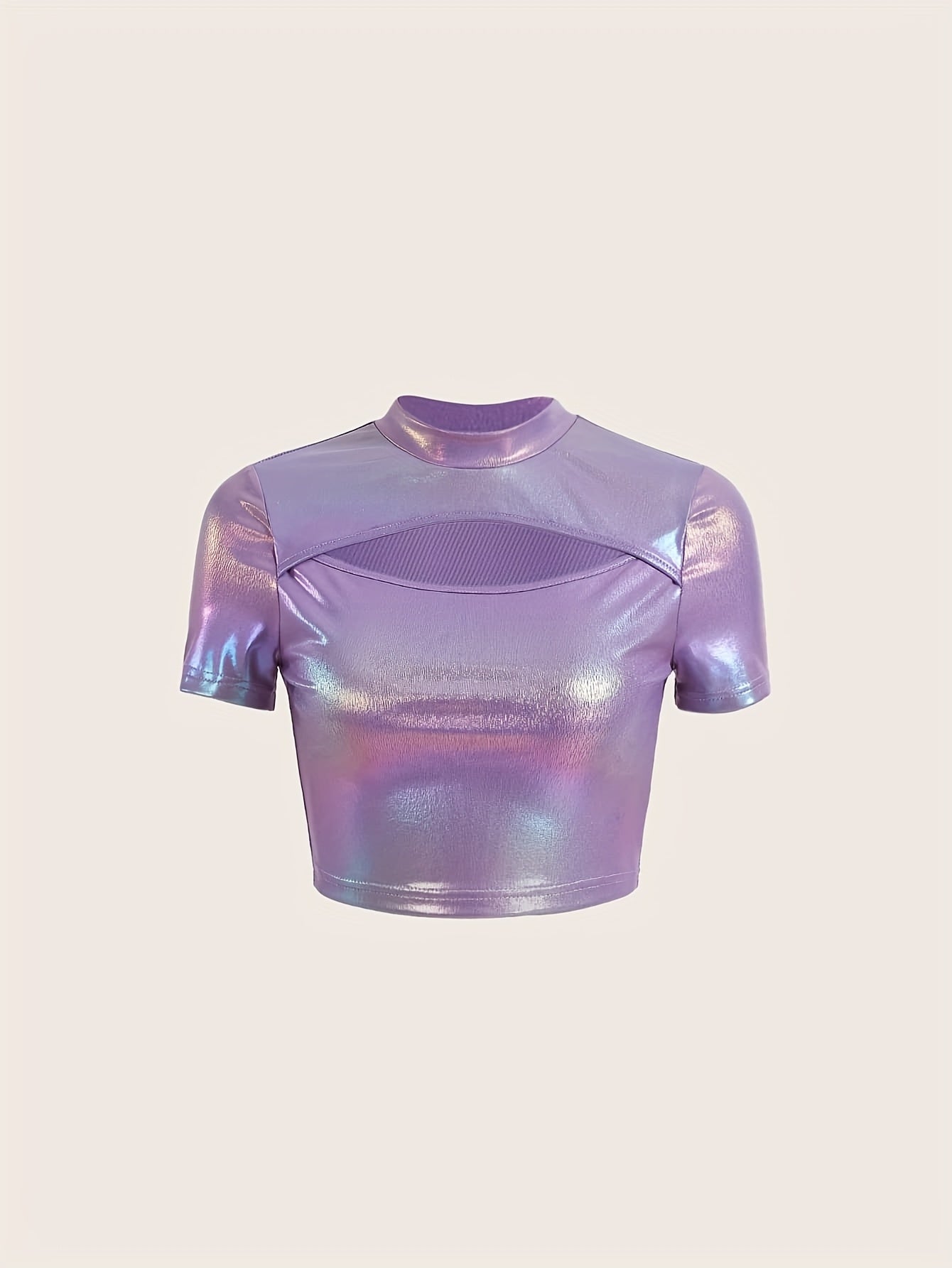 HG Women's Sexy Slim Fit Round Neck Short Sleeve T-Shirt - Hollow-Out Design, Shimmering Purple-Pink-Purple Gradient, Medium Stretch Fabric, All-Season Versatile Top, Evening Wear, Elegant Style, Glossy Finish, Casual Top, Br
