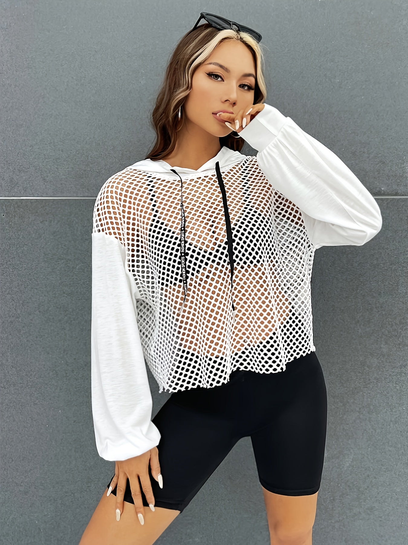Hollow Out Drawstring Hoodies, Sexy Solid Long Sleeve Sweatshirt, Women's Clothing
