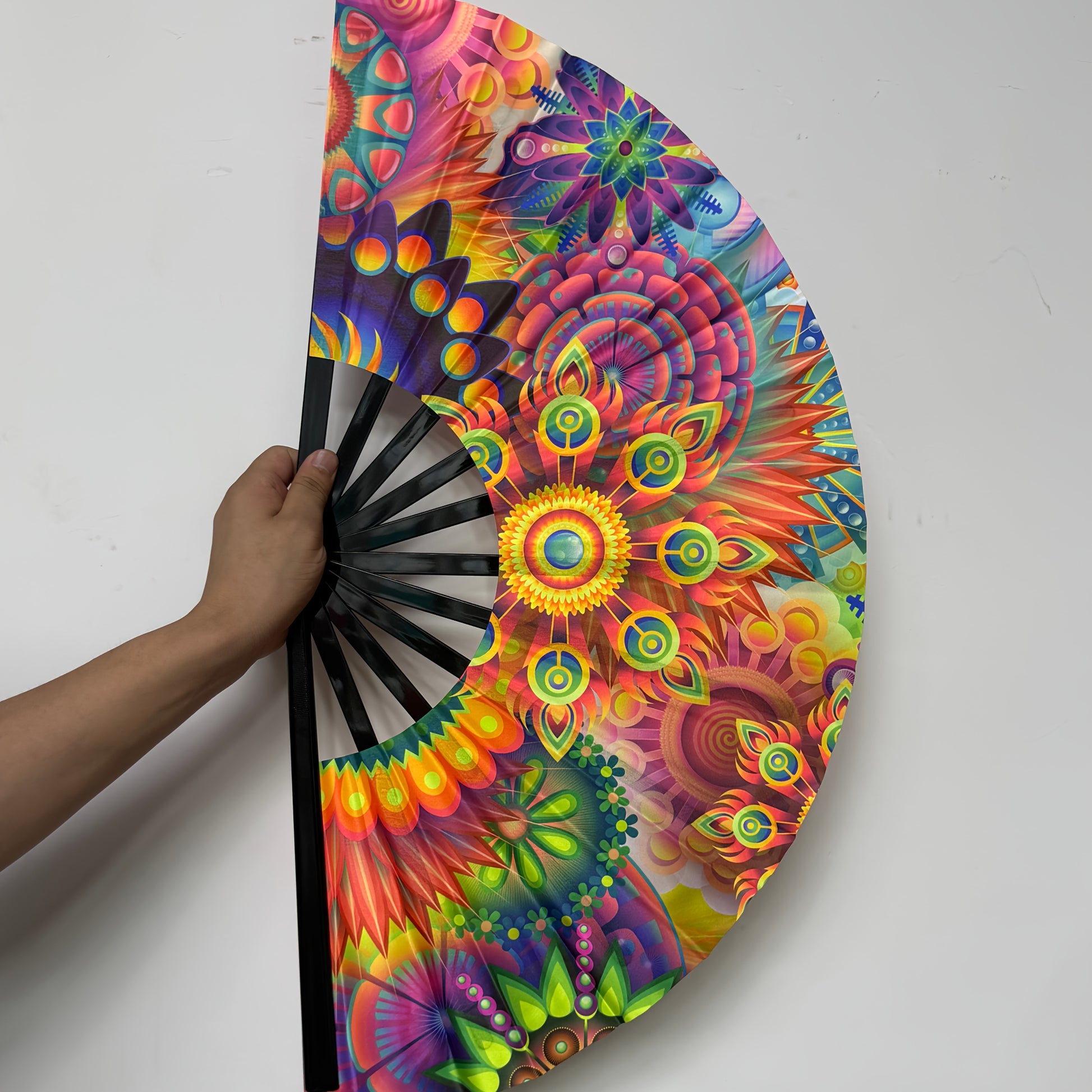 Large Fluorescent Kung Fu Folding Fan - Vibrant Multicolor Feather Design, Foldable Battery-Free Fan for EDM Festivals, Drag Queen Performances, Parties & Events