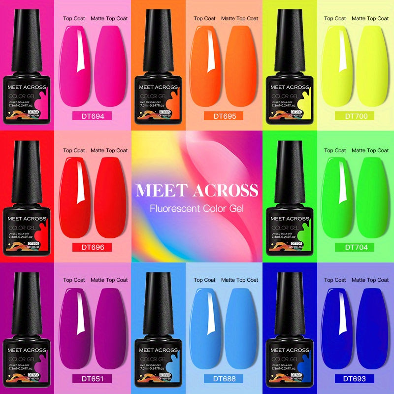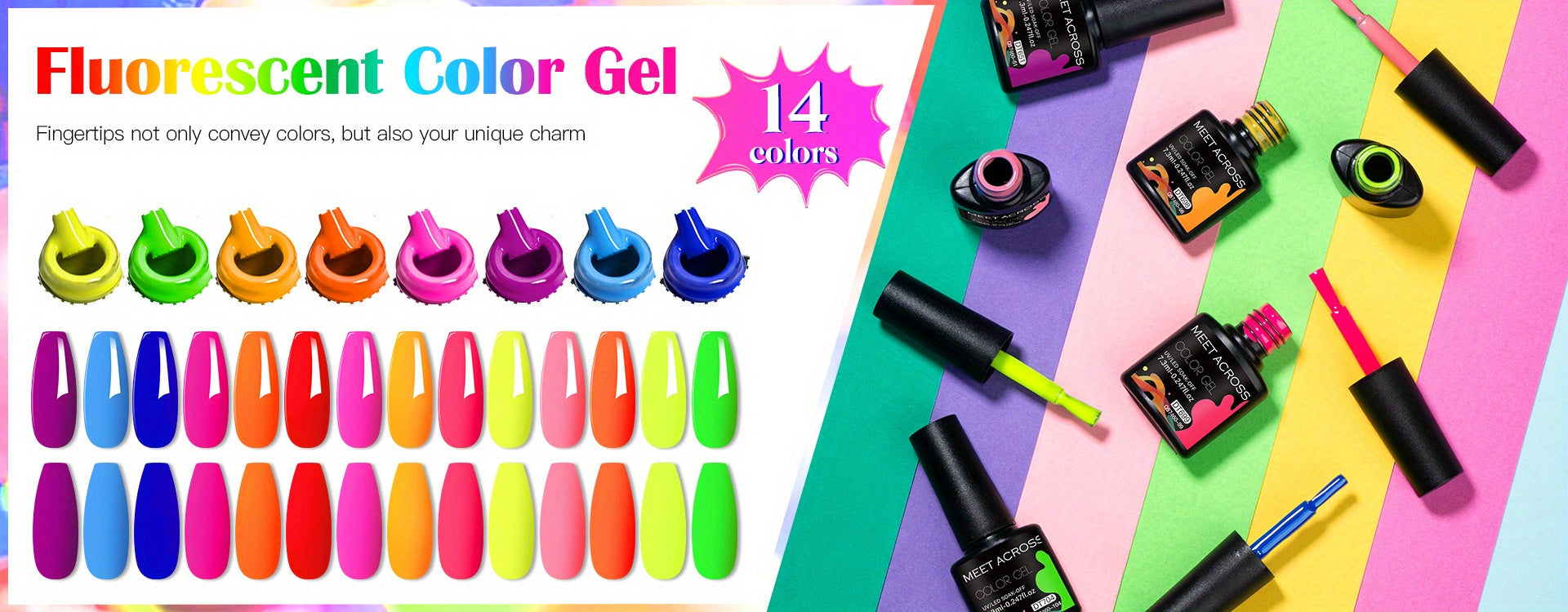 MEET ACROSS 14 Colors Fluorescent Neon Gel Nail Polish - Semi-Permanent Soak Off LED/ Curable, & Fragrance-Free Nail Art Manicure Varnish for Vibrant Glossy Finish, Highshine Nails, Professional Quality, Salon Professionals