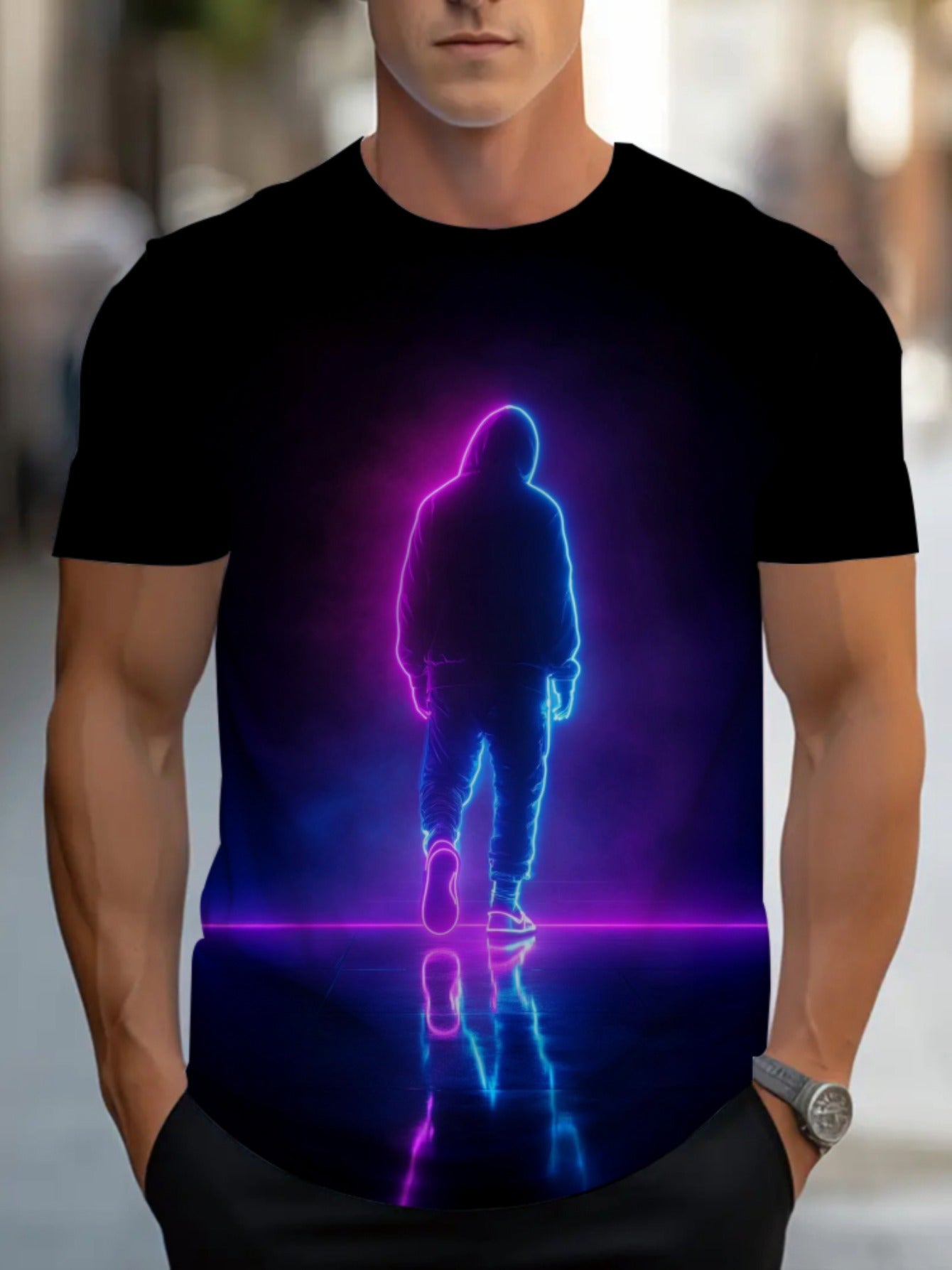 Men'S Neon Silhouette Graphic T-Shirt - Trendy Black Casual Sport Tee with Vibrant Pink & Blue Glow Design, Short Sleeve, Round Neck, Perfect for Everyday Wear, Everyday Tshirt | Trendy Casual Shirt | Stretchy Fabric