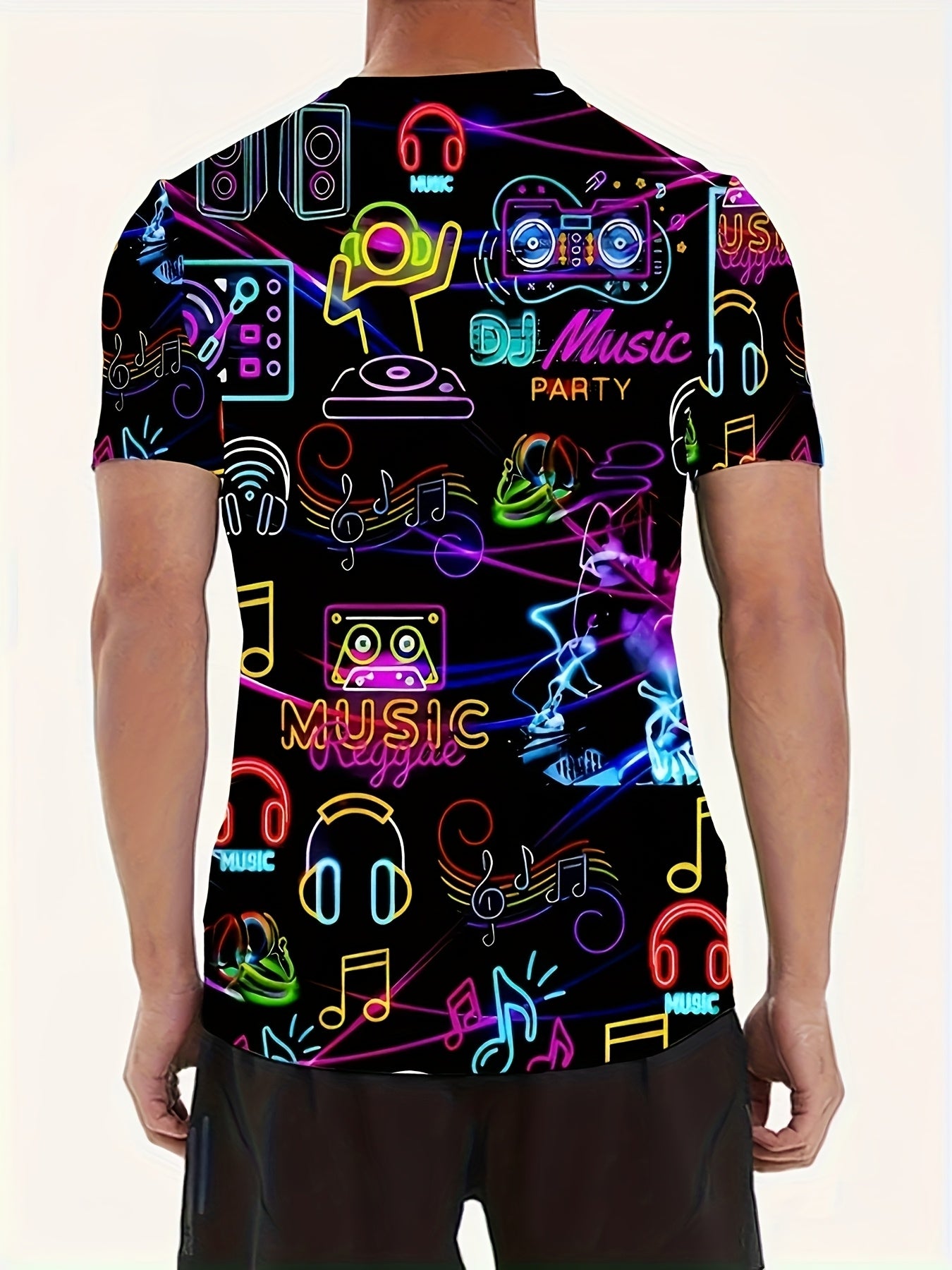 Men'S Retro Party Night T-Shirt - Vibrant Neon Music & DJ Design, Polyester, Short Sleeve Crew Neck - Machine Washable, All-Season Casual Tee with "PARTY NIGHT" Print, Ideal for Parties & Casual Attire, Summer Tee|Discothemed