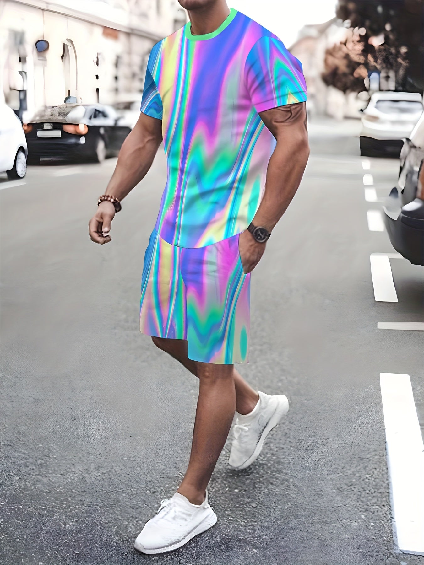 Men'S Vibrant 3D Neon Print Casual Shorts & T-Shirt Set - Stretchy, Anti-Pilling Fabric, White Sneakers, Perfect for Streetwear & Casual Attire, Streetwear Outfit|Vibrant Print Design|Stretchy Fabric