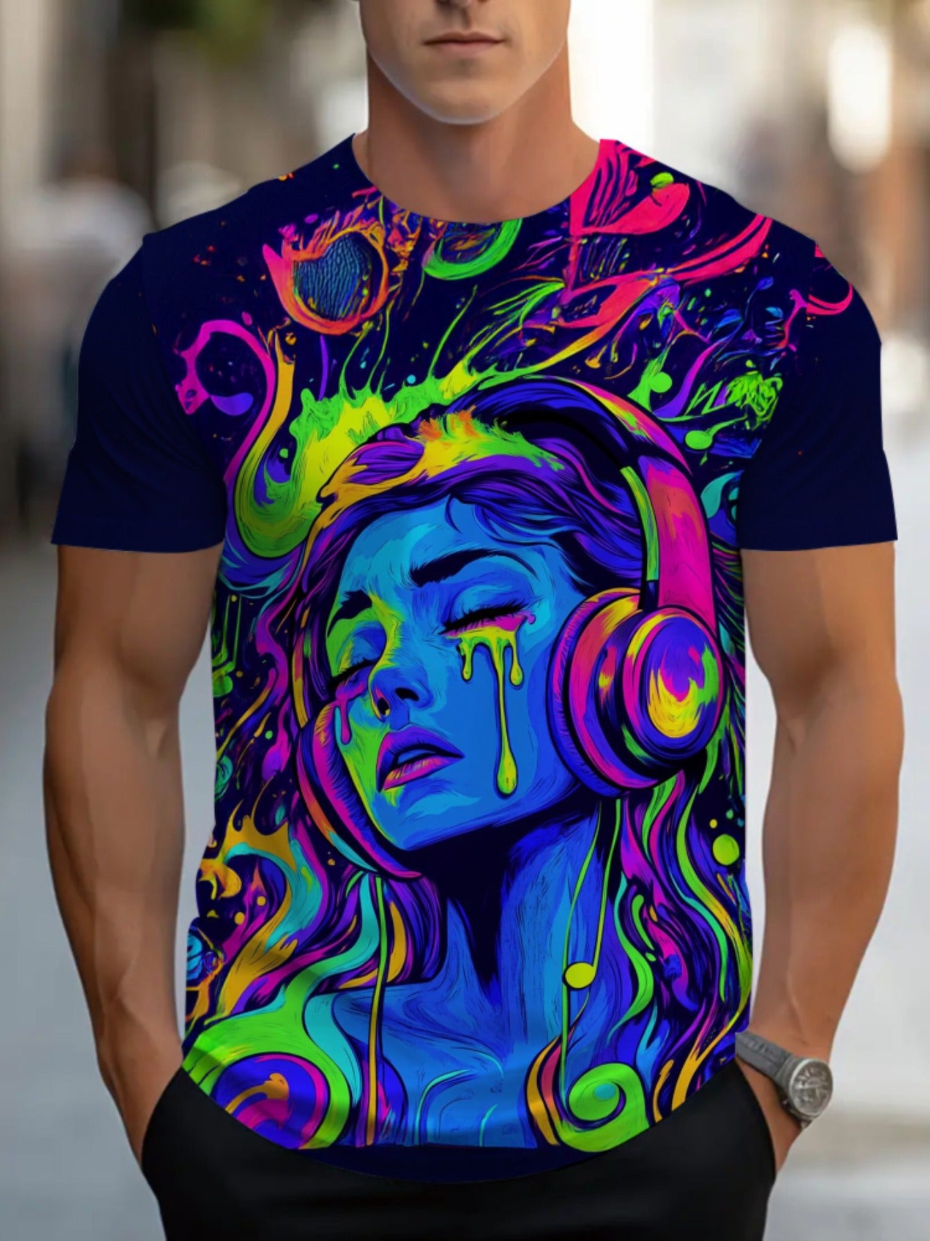 Men'S Vibrant Neon Art T-Shirt - Psychedelic Woman with Headphones Graphic, Colorful Swirl Design, Casual Crew Neck, Perfect for Festivals & Parties, Festival Clothing | Psychedelic Graphic Tee | Stretchy Fabric