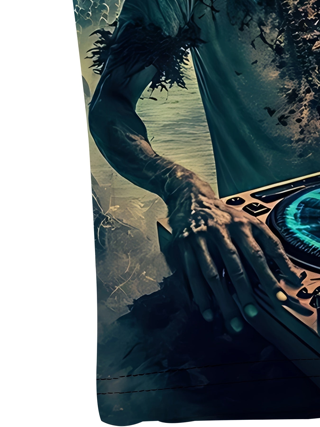 Men's Zombie DJ Graphic T-Shirt - with Glowing Green Eyes, Dark Blue Crew Neck Tee for EDM Clubs, Halloween Parties & Streetwear - Machine Washable Summer Shirt for Music Lovers, Party Outfit, Bold Print, Highquality Print, S