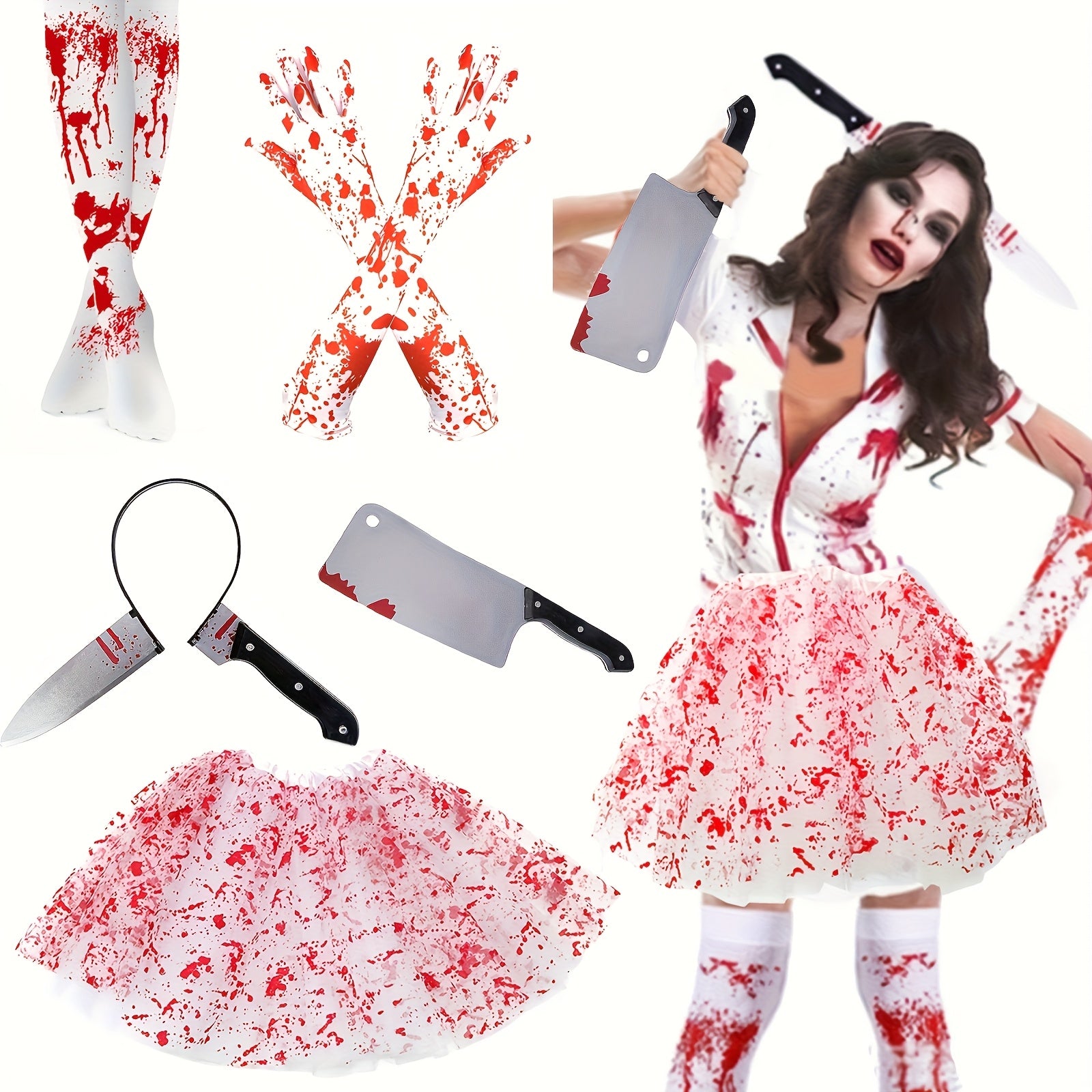 New Halloween Party Decorations Including Bloody Gloves, Blood-Stained Socks, And Aprons, Along with Plastic Pointed Knives And Handheld Cleavers for Costume Parties, Without Battery
