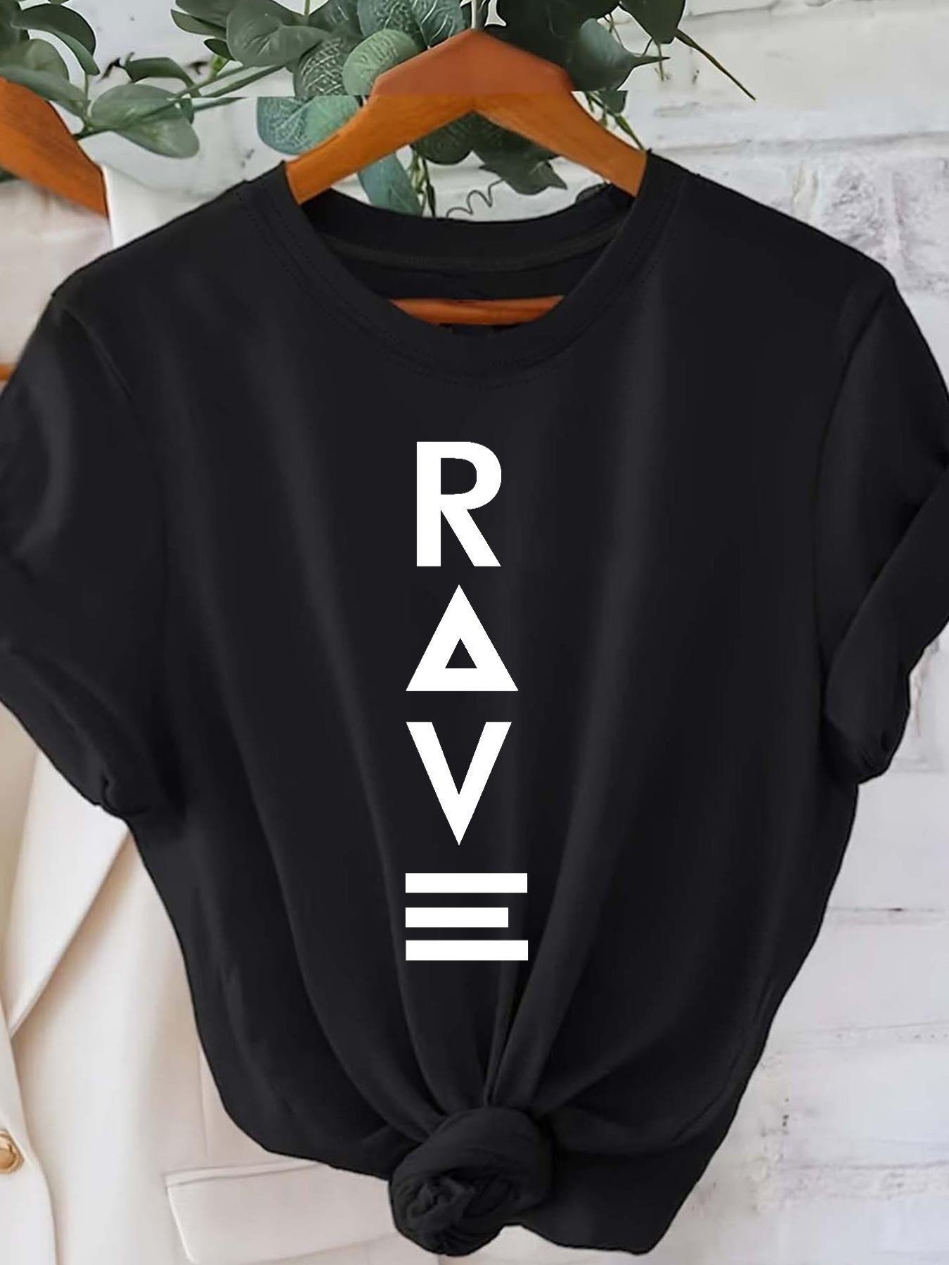 Women's Casual Short Sleeve T-Shirt - Black with Vertical White RAVE Print, Relaxed Fit Round Neck, Machine Washable All-Season Comfort Top, Rave Clothing, Classic Round Neck, Nontransparent Fabric