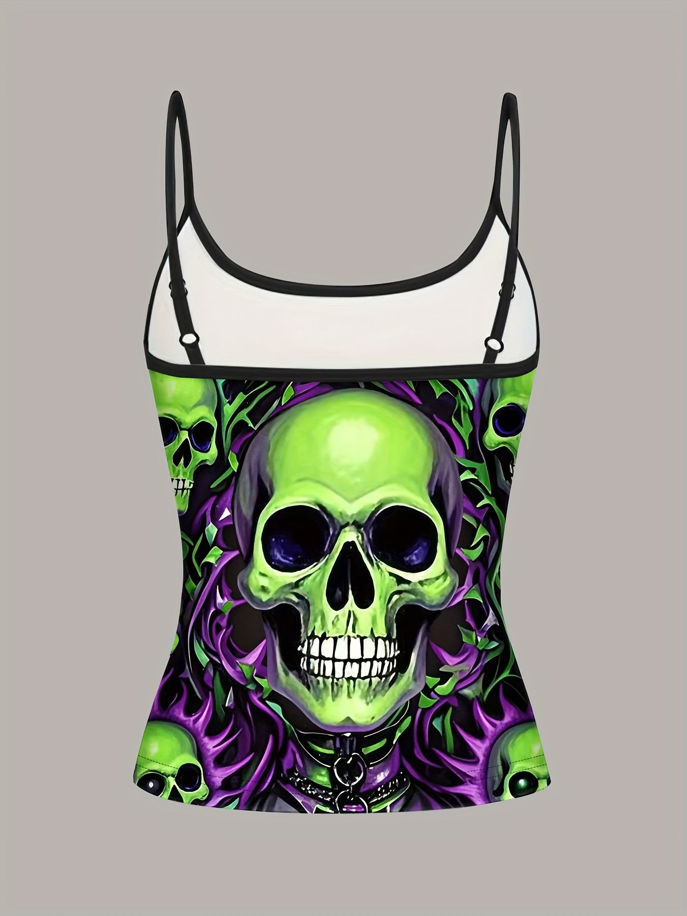 Women's Gothic Skull Print Cami Top - Vibrant Neon Green & Purple Design, Sleeveless Spaghetti Strap, Machine Washable, Edgy Summer Fashion for Bold Style, Trendy Casual Wear, Mysterious Aesthetic, Nontransparent Fabric