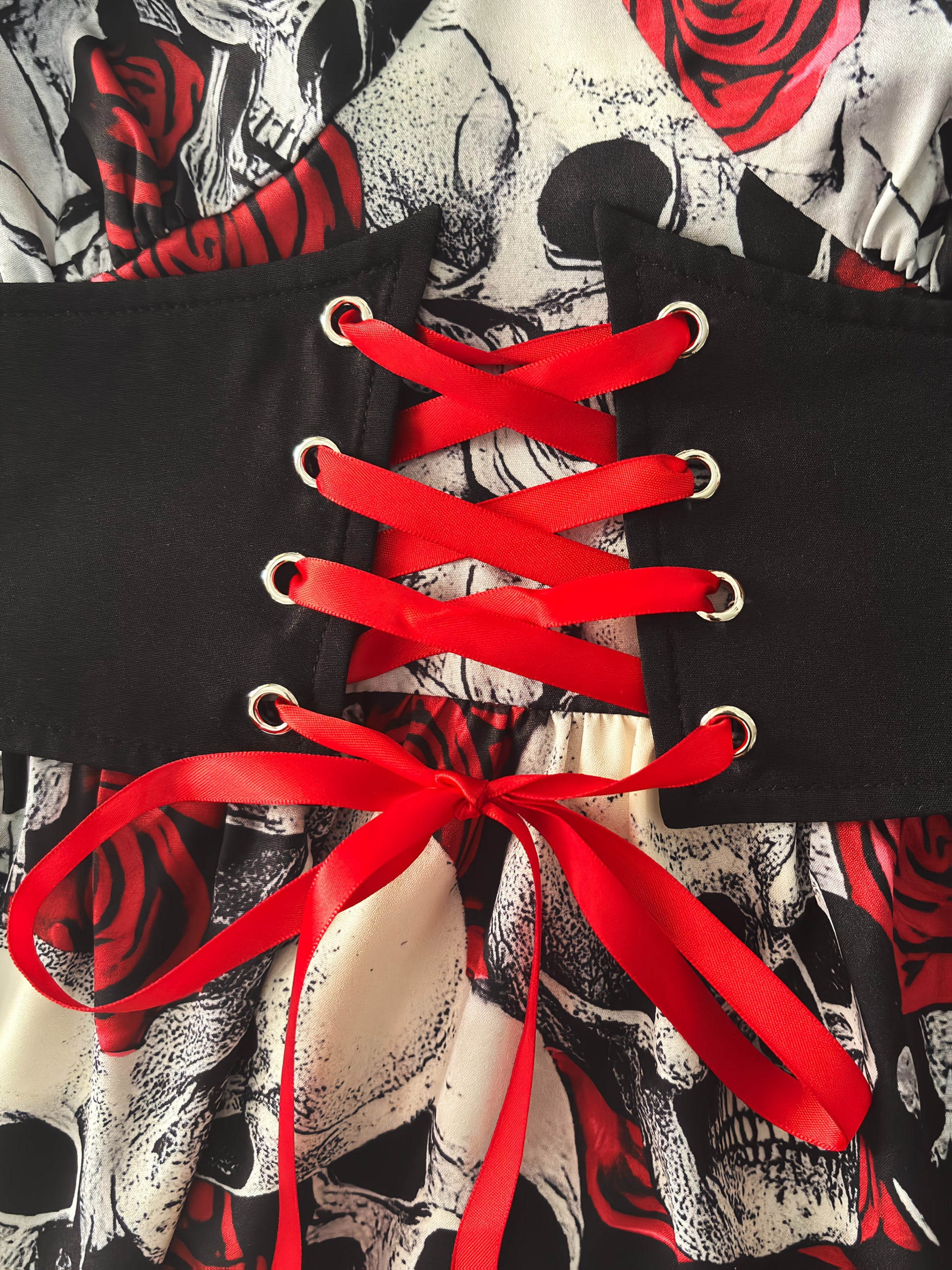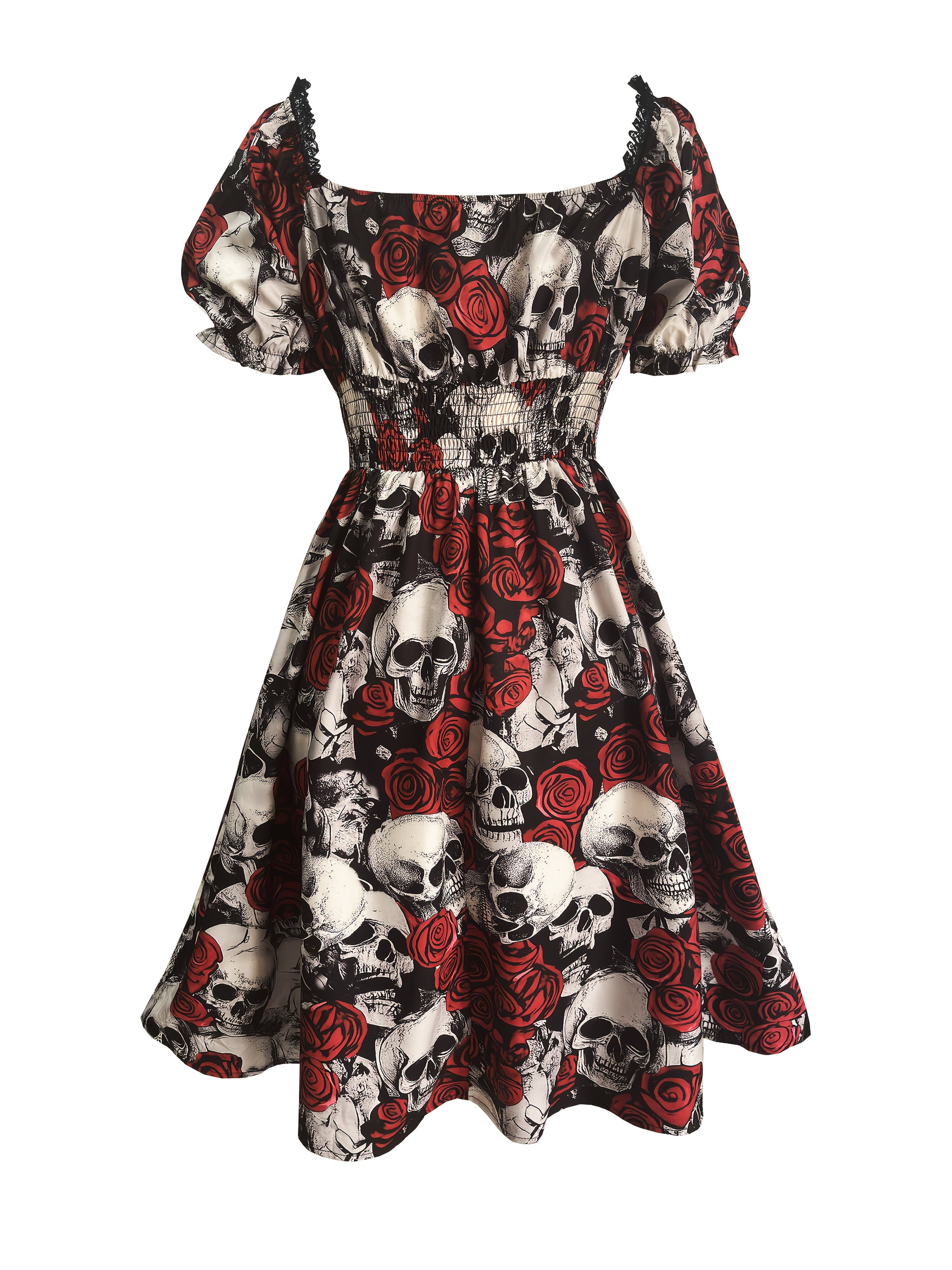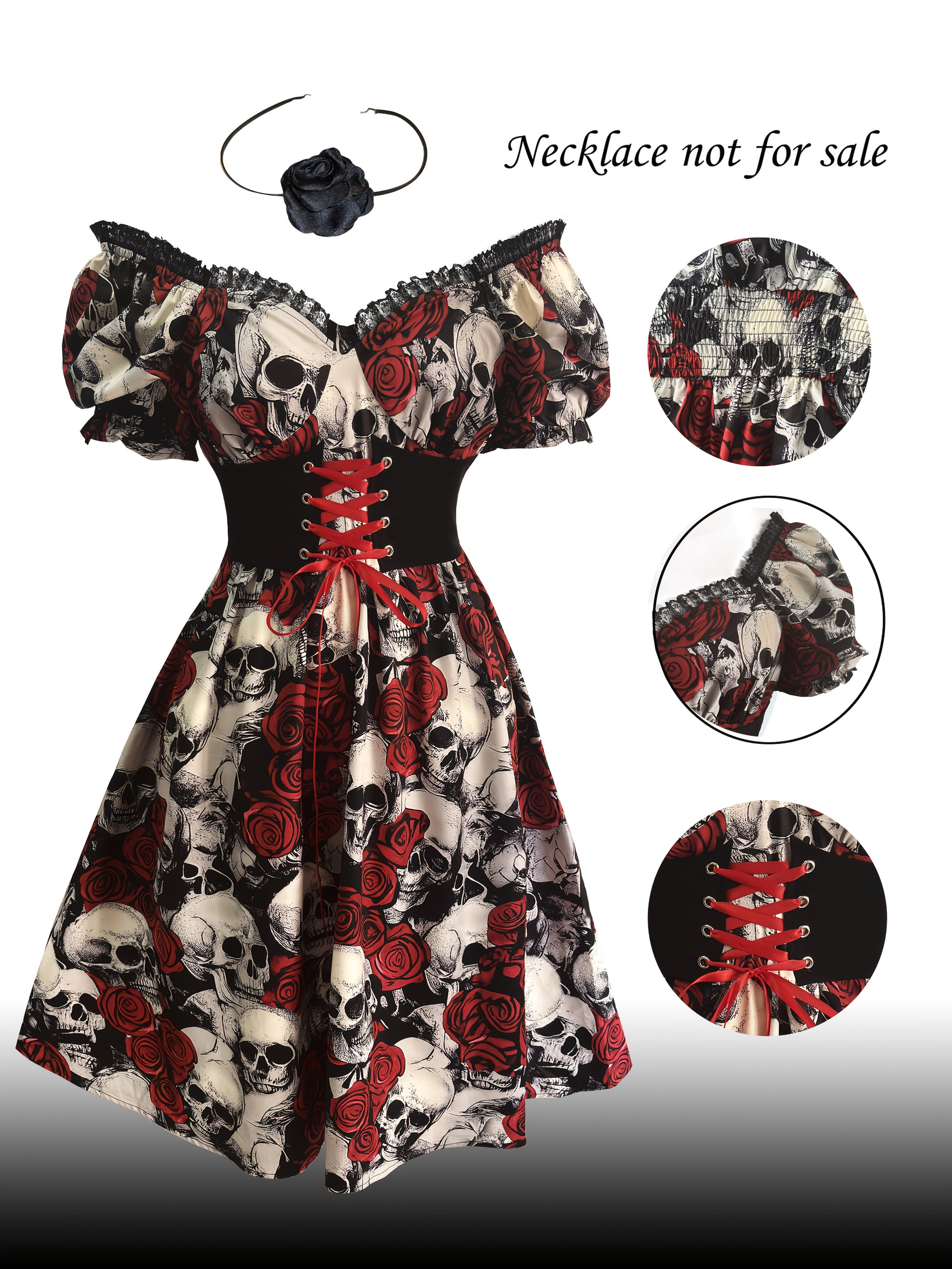 Women's Gothic Y2K Skull & Rose Print Gothic Victorian-Style Dress with Ruffled Hem & Spaghetti Strap - Lace-like Sleeve Neckline, Corset Back Closure, Machine Washable - Elegant Party Outfit for Halloween, Day of the Dead, T