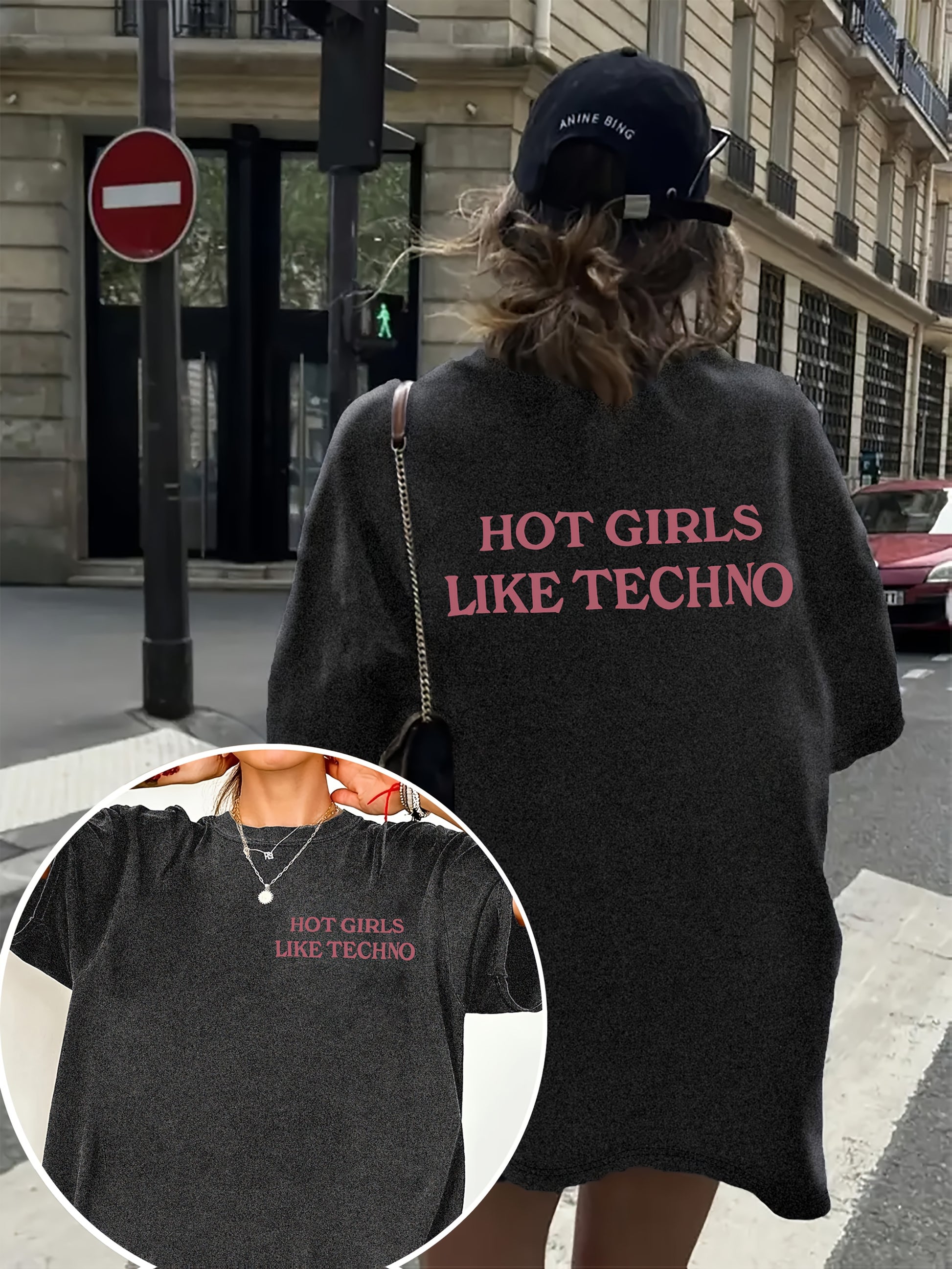 Women's TECHNO Graphic Tee - Lightweight Breathable T-Shirt with Front & Back Pink Slogan Print - Machine Washable Clubbing Shirt for DJs, raves, techno Parties - All-Season Casual Top, Rave Outfit, Bold Statement Design, Com